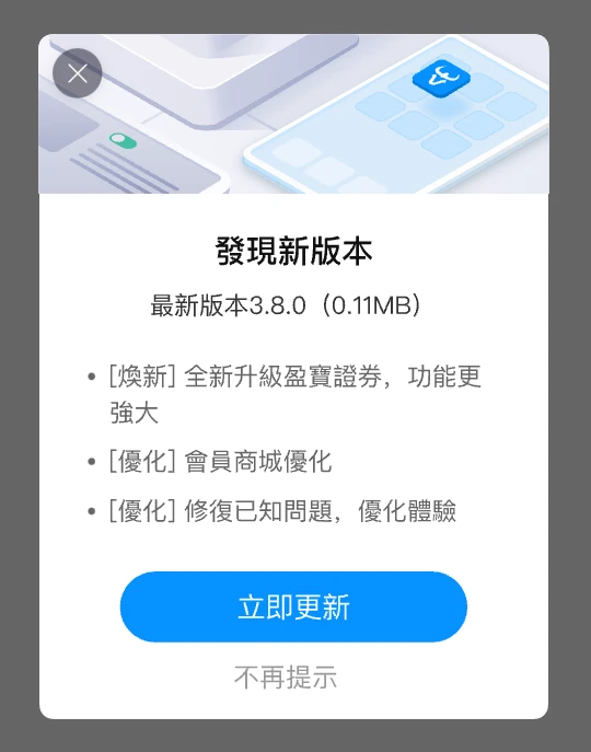 APP內更新提醒,當APP全量更新後,您啟動APP時會收到升級彈窗提醒,您可點擊 【立即更新】 更新到最新APP版本