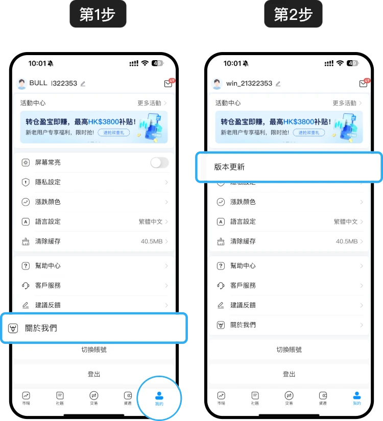 在盈寶證券APP內,通過盈寶證券App “我的” - “關於我們” - “版本更新” ,檢查並更新至最新版本。