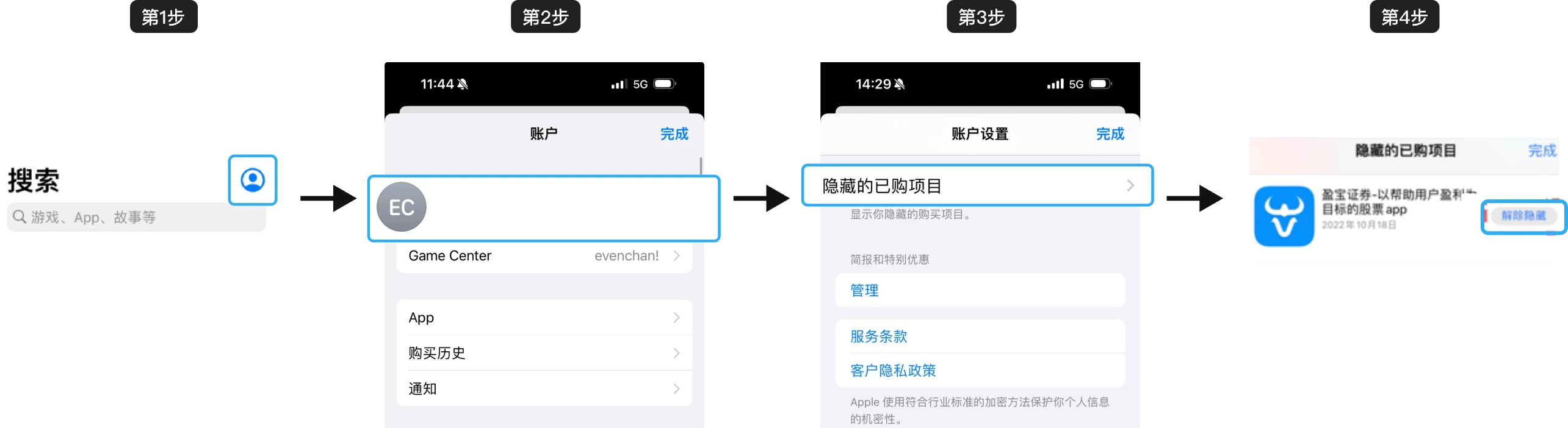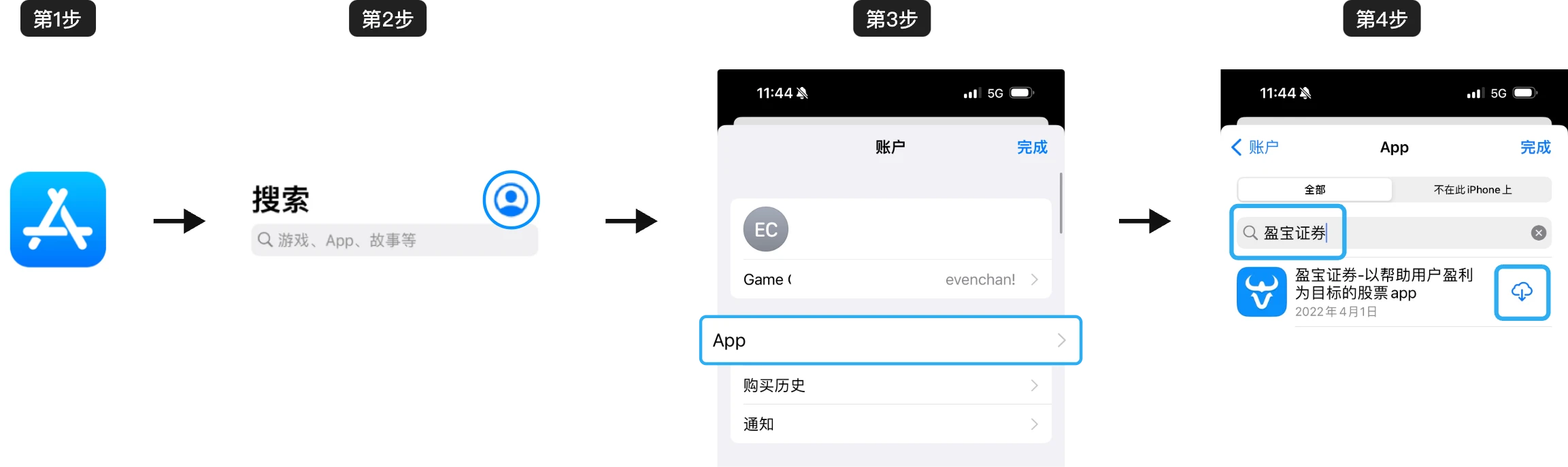 如果您的蘋果帳戶曾經下載過但不慎刪除了盈寶證券APP直接進入APP Store下載。點擊右上角的頭像,進入【帳戶】頁面點擊【已購專案】,再切換右邊的【不在此iPhone上】按鈕,可以查看到已安裝過的APP,下載安裝盈寶證券APP.